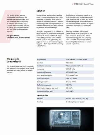 In 2019, the Scottish government declared a climate emergency and introduced a target for the whole country to become carbon neutral by 2045. Scottish Water strives to find ways to be increasingly sustainable and to support Scotland’s ambitions for renewable energy generation, carbon reduction and environmental performance in order to safeguard Scottish water resources for future generations. True to its mission to keep Scottish people supplied with world class water and care for the natural water environment every minute of every day and in every area of their activities, Scottish Water has gone even further in its ambition than the government, targeting carbon neutrality by 2040. It has also set an interim target to host or generate three times its annual electricity consumption by 2030.